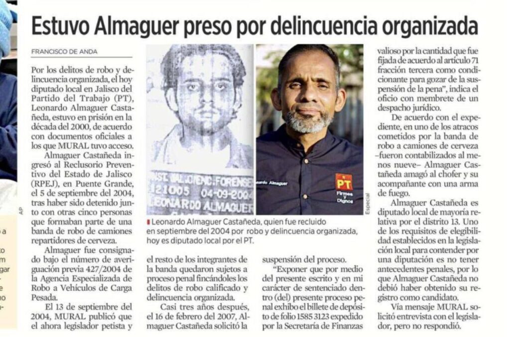 El hoy diputado local del Partido del Trabajo (PT) en Jalisco, Leonardo Almaguer Castañeda, aliado político de Morena en el Congreso del Estado, estuvo preso por los delitos de robo y delincuencia organizada, de acuerdo con documentos oficiales publicados por el diario MURAL.