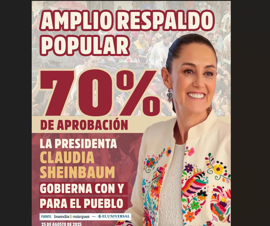 Claudia Sheinbaum llega a su Primer Informe de Gobierno con un nivel de aprobación del 70%, frente a un 18% de desaprobación y un 7% que ni aprueba ni reprueba, según la encuesta nacional realizada por Buendía & Márquez para El Universal en agosto de 2025.